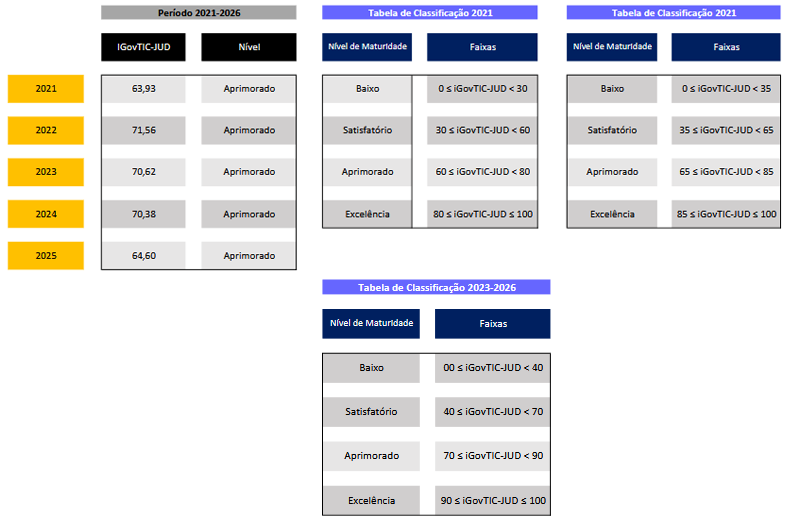 O primeiro período de aplicação do iGovTIC-JUD foi de 2016 a 2020. Em 2021 inaugurou-se um novo período que irá perdurar até o ano de 2026 com a introdução de nova metodologia de cálculo.