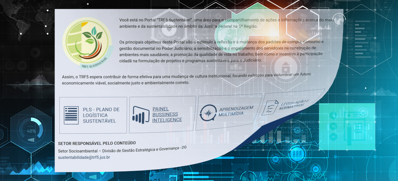O “TRF5 Sustentável” é uma área para o compartilhamento de ações e informações sobre meio ambiente e sustentabilidade no âmbito da Justiça Federal na 5ª Região, com os objetivos de estimular a reflexão e a mudança dos padrões de compra, consumo e gestão documental no Poder Judiciário; a sensibilização e o engajamento dos(as) servidores(as); a promoção da qualidade de vida no trabalho; e o incentivo à participação cidadã na formulação de projetos e programas sustentáveis.