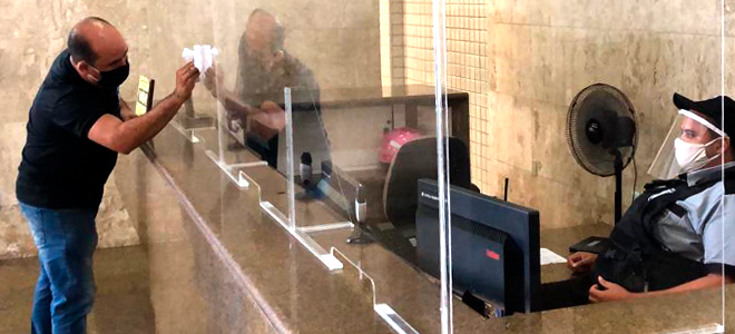 Entre as ações realizadas está a instalação de painéis de acrílico na recepção principal do edifício-sede do TRF5, que funcionarão como uma barreira de proteção contra o vírus. O equipamento também será instalado em outras áreas que trabalham com atendimento ao público, como as Secretarias do Pleno e das Turmas, a Subsecretaria de Recursos, o Protocolo, além das unidades do Malote, Distribuição e Reprografia.