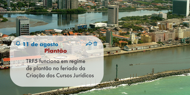 O Tribunal Regional Federal da 5ª Região - TRF5 funcionará em regime de plantão judicial na próxima quinta-feira (11/8), devido ao feriado que comemora o dia da instituição dos Cursos Jurídicos no Brasil (Lei Federal nº 5.010/66).