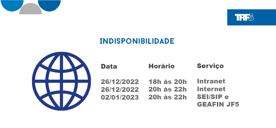 O Tribunal Regional Federal da 5ª Região – TRF5 comunica que os serviços e sistemas da Intranet da Corte estarão indisponíveis no próximo dia 26 de dezembro (segunda-feira), das 18h às 20h. No mesmo dia, o site do TRF5 também sairá do ar, das 20h às 22h.