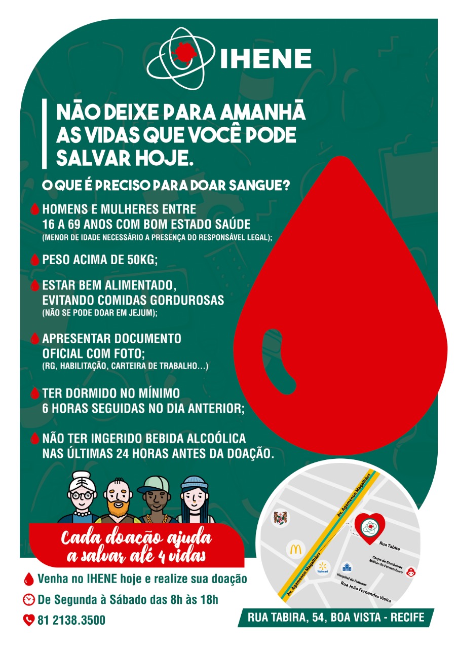 O(a) doador(a) pode ter qualquer tipo sanguíneo e deverá levar um documento com foto original, (não pode ser xerox), o nome completo do paciente e o nome do hospital onde fez o atendimento ou onde está internado (Real Hospital Português). É importante destacar que a doação de uma pessoa vai ajudar não somente ao paciente específico, mas também poderá salvar outras vidas.