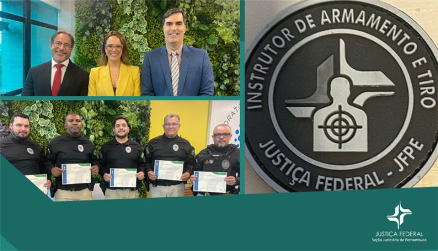A Justiça Federal em Pernambuco (JFPE) realizou, nessa segunda-feira (03/11), a cerimônia de entrega de certificados do primeiro Curso de Instrutor de Armamento e Tiro da Justiça Federal de Pernambuco, formando 11 novos professores aptos a atuar na capacitação de policiais judiciais, juízes, servidores. A entrega aconteceu no Laboratório de Inovação (LABI), no prédio sede da JFPE.