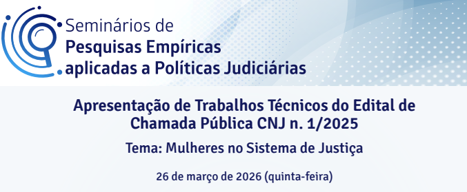 O Departamento de Pesquisas Judiciárias do Conselho Nacional de Justiça (CNJ) realizará, no dia 26/03, a apresentação de trabalhos técnicos do edital de Chamada Pública CNJ n. 1/2025, com o tema “Mulheres do Sistema de Justiça”. O evento acontece das 17h às 19h, por meio da plataforma virtual Cisco Webex, com transmissão pelo canal do CNJ no Youtube.